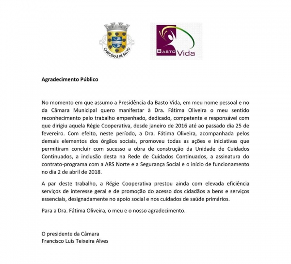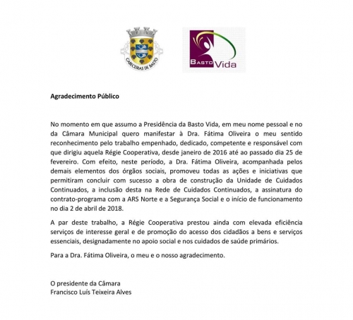 Confira na foto, o comunicado de agradecimento da autarquia de Cabeceiras de Basto.