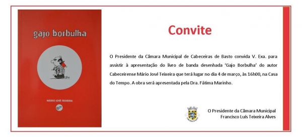 No próximo dia 4 de março (sábado), pelas 16h00, realizar-se-á na CASA DO TEMPO a cerimónia de lançamento do livro “GAJO BORBULHA”, uma publicação em banda desenhada da autoria do criativo MÁRIO JOSÉ TEIXEIRA, nosso talentoso conterrâneo.